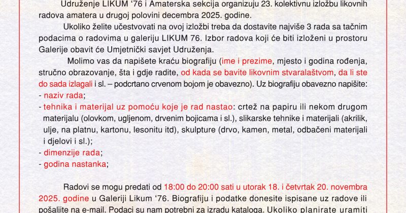 Radovi se mogu predati od 18:00 do 20:00 sati u utorak 18. i četvrtak 20. novembra 2025. godine u Galeriji Likum ‘76. Biografiju i podatke donesite ispisane uz radove ili pošaljite na e-mail. Podaci su nam potrebni za izradu kataloga. Ukoliko planirate uramiti radove i staviti pod staklo dobro bi bilo da ih donesete neuramljene pa da nakon fotografisanja to učinite.
