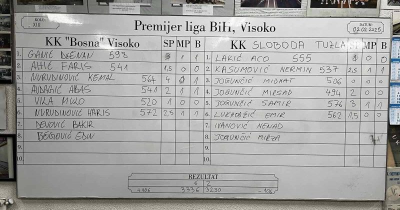 U okviru 13. kola Premijer lige Bosne i Hercegovine u kuglanju KK “Bosna” Visoko je na domaćem terenu savladao KK “Sloboda” iz Tuzle rezultatom 6:2 (3336 – 3230).