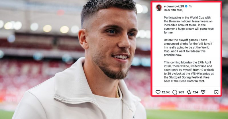 “Dragi navijači Stuttgarta, učestvovanje na Svjetskom prvenstvu sa reprezentacijom Bosne mi nevjerovatno znači, ovog ljeta će mi se ostvariti ogroman san. Prije utakmica baraža najavio sam pića za navijače ako ću se s reprezentacijom plasirati na Svjetsko prvenstvo i sada želim ispuniti to obećanje. Idućeg ponedjeljka, 27. aprila 2026. u periodu od 19 do 20 sati u VfB-Wassentagu na Proljetnom festivalu u Stuttgartu čekat će vas besplatno pivo u Benz Hofbräu šatoru. Također, djeca će na jednom od narednih javnih treninga naše ekipe imati besplatne sladolede. Također odlučio sam finansijski podržati VfB fondaciju Brustring der Herzen (Prsten srca na grudima). Mnogo se veselim što ću vas vidjeti u ponedjeljak na Proljetnom festivalu, Vaš Medo.” napisao je Demirović na Instagramu.