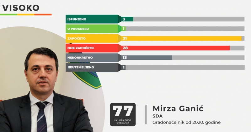 Iz programa načelnika Visokog Mirze Ganića u prvoj godini mandata ispunjena su obećanja o modernizaciji ulice Alije Izetbegovića, koja je okončana u augustu 2025. godine, Čaršijska ulica je pretvorena u šetnicu, a izgrađen je i kružni tok na spoju regionalne ceste R443 i autoceste A1. U progresu je ispunjavanje obećanja o rekonstrukciji puta Ozrakovići, Kadije Uvejsa i Bosne Srebrene s izgradnjom pješačke staze. Od ukupno 77 obećanja iz Ganićevog programa, 31 nosi ocjenu započeto, čak 13 ih je ocijenjeno kao nekonkretno, a jedno kao neutemeljeno.