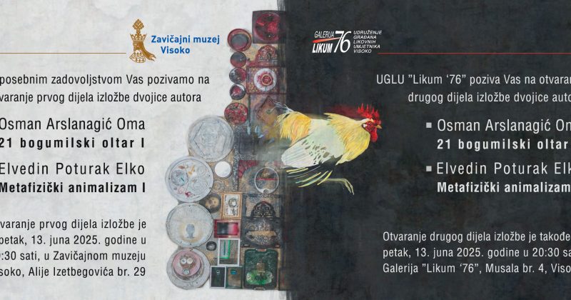U petak, 13. juna ove godine, biće upriličeno otvaranje zajedničke izložbe autora Osmana Arslanagića i Elvedina Poturka, a ono što je zanimljivo jeste činjenica da se izložba sastoji iz dva dijela. Prvi dio izložbe biće svečano otvoren u prostorijama Zavičajnog muzeja s početkom u 19.30 sati, a sat kasnije, u 20.30, drugi dio izložbe će biti otvoren u Galeriji “Likum '76”.